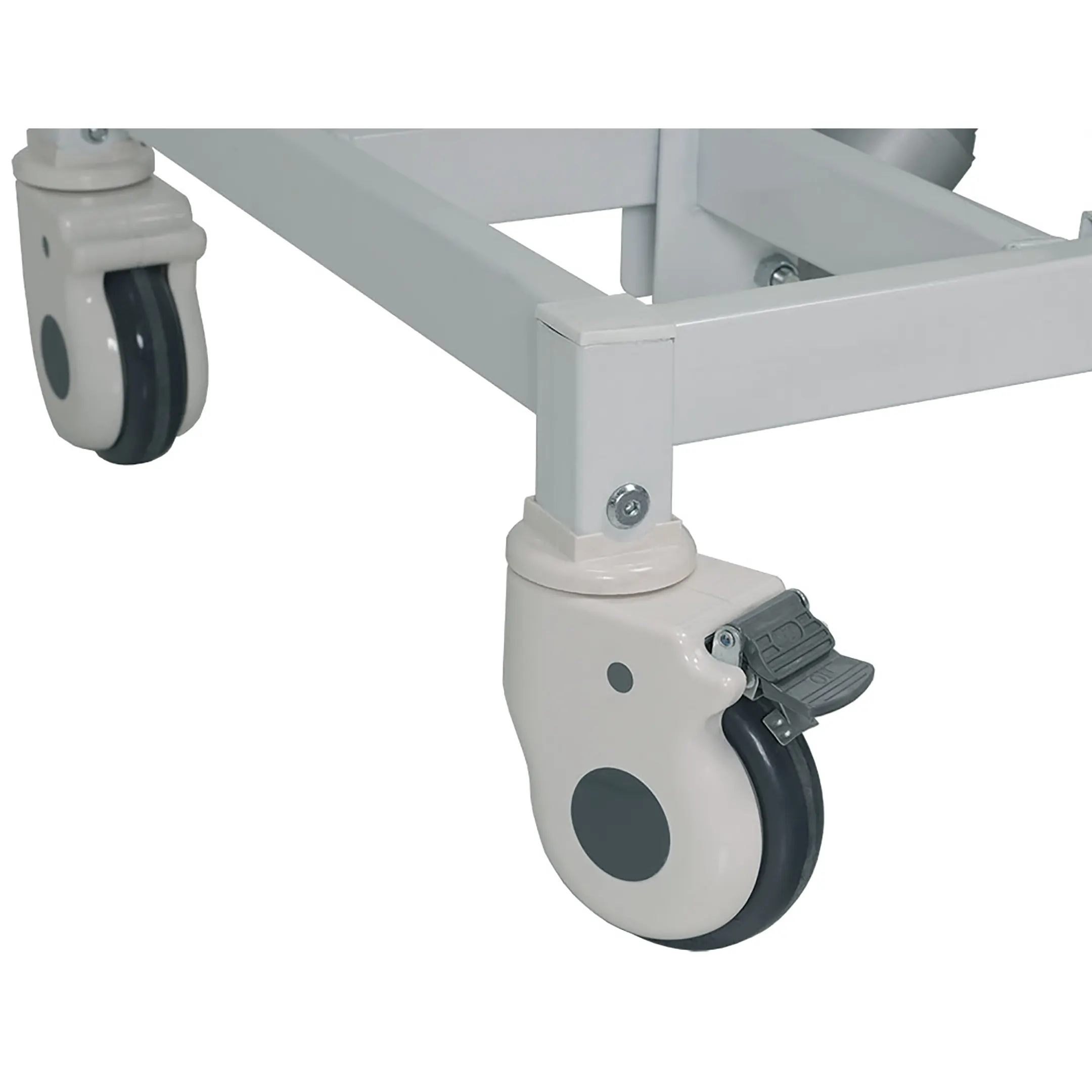 • установлена на 4 самоориентирующиеся колеса диаметром 125 мм, 2 колеса с тормозным устройством, покрытие колес серая резина (не оставляющая следов на полу);