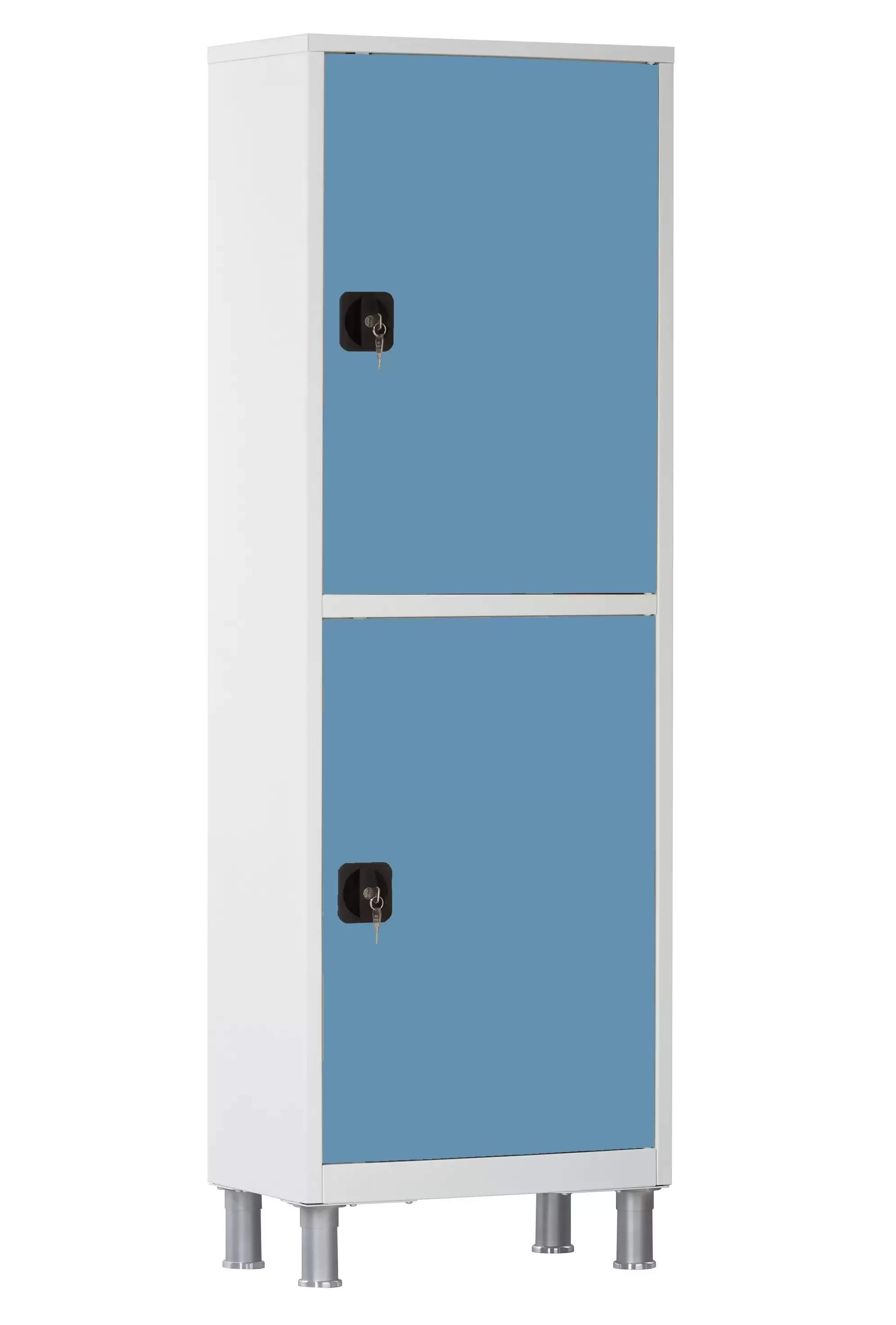 Шкаф медицинский металлический двухсекционный одностворчатый ШМ-03-МСК с ригельными замками и регулируемыми опорами предназначен для размещения и хранения лекарственных средств, перевязочных материалов, инструментов, медицинских расходных материалов и других изделий медицинского назначения.