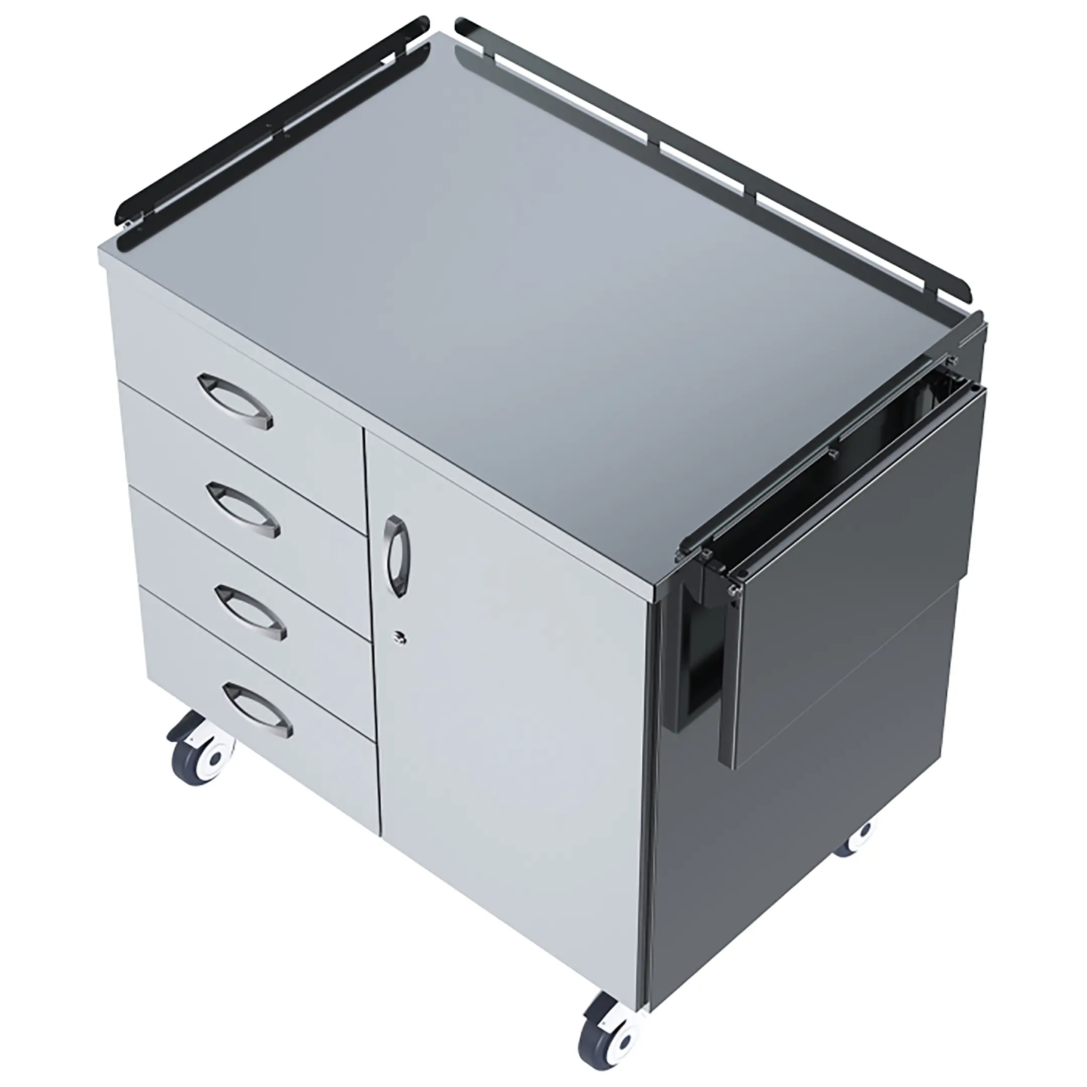 • колеса поворотные, самоориентирующиеся, диаметром 100 мм, комплектуются надёжной стальной вилкой с прецизионным радиально-упорным подшипником, ободом из полипропилена и шинкой из серого полиуретана, не оставляющего следов на полу, два колеса – с индивидуальным тормозным устройством;
