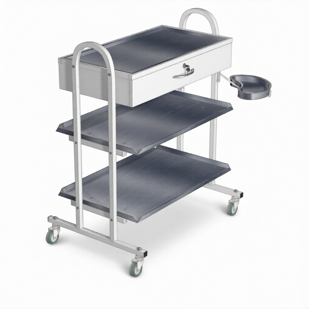 Стол инструментальный с ящиком (колеса резина) СМя-3 (каркас белый) — это многофункциональный мобильный стол, применяемый для размещения инструмента, материалов и медикаментов, в том числе в стоматологической практике, в кабинетах врачей, перевязочных, операционных, на постах медицинских сестер в отделениях больниц, клиниках, поликлиниках и других медицинских учреждениях. Модель имеет три полки из нержавеющей стали, выдвижной ящик с замком и кронштейн с тазиком.