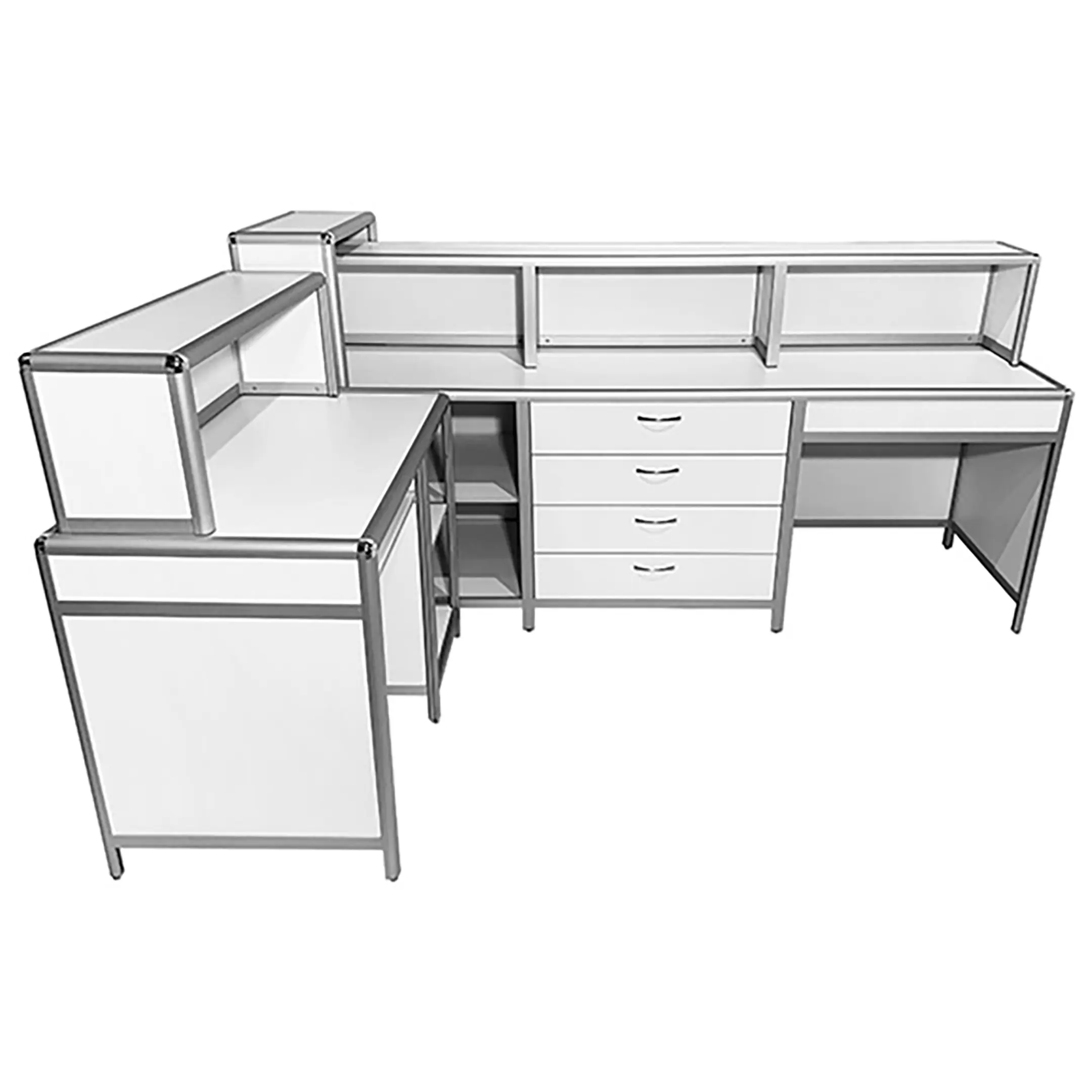 - Качественные материалы — обшивка из ЛДСП 8 мм, столешницы из ЛДСП 16 мм белого цвета, устойчивые к влажной уборке и обработке дезинфицирующими средствами.