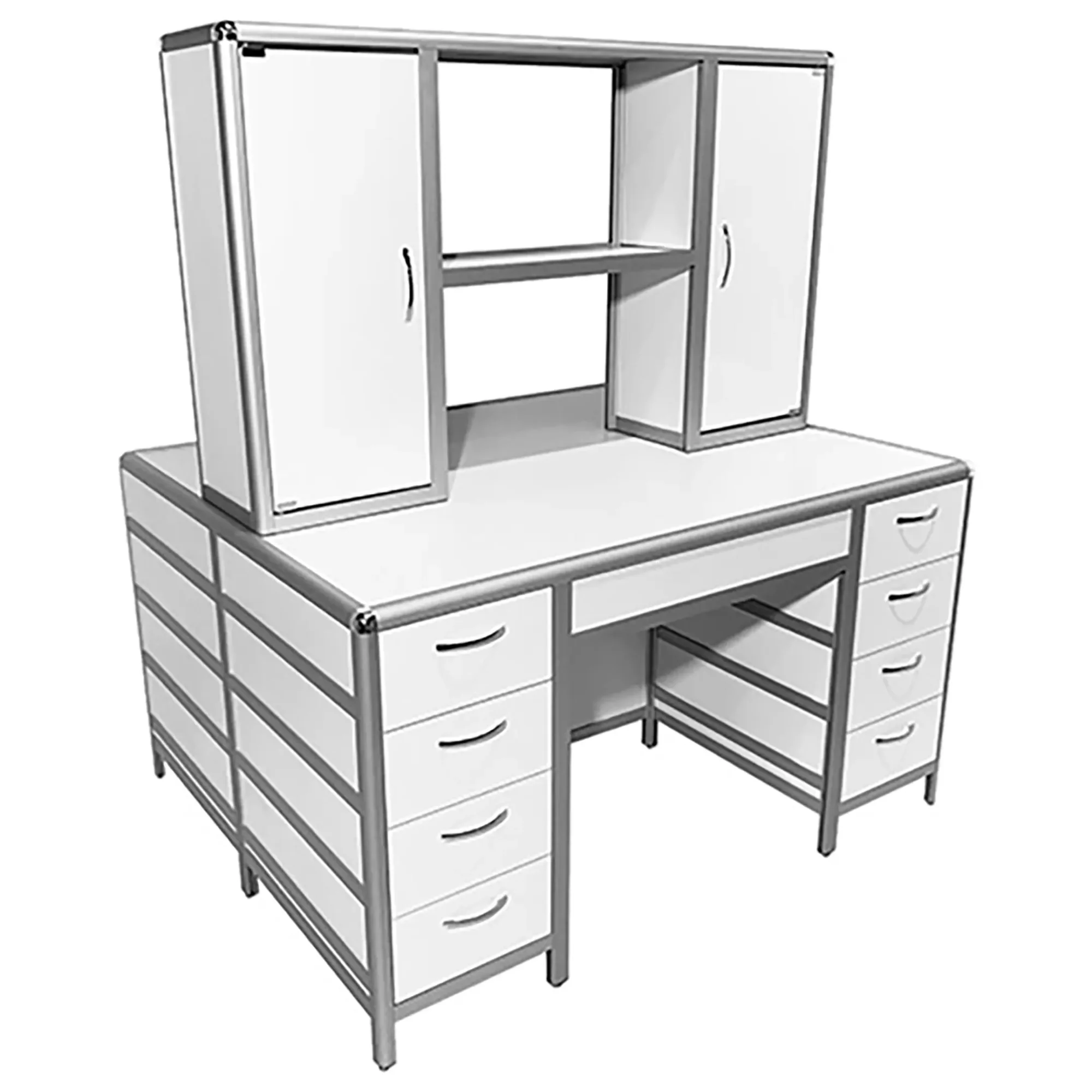 Стол лабораторный островной MED 11.005al с надстройкой (белый) — это удобное и функциональное решение для создания двух рабочих мест в лабораториях и медицинских учреждениях, позволяя эффективно использовать пространство помещения. Модель оснащена двумя рабочими местами, каждое с двумя боковыми тумбами, имеющими четыре выдвижных ящика, а также центральной надстройкой с двумя тумбами. Каркас выполнен из алюминиевого профиля, столешница из ЛДСП толщиной 22 мм.