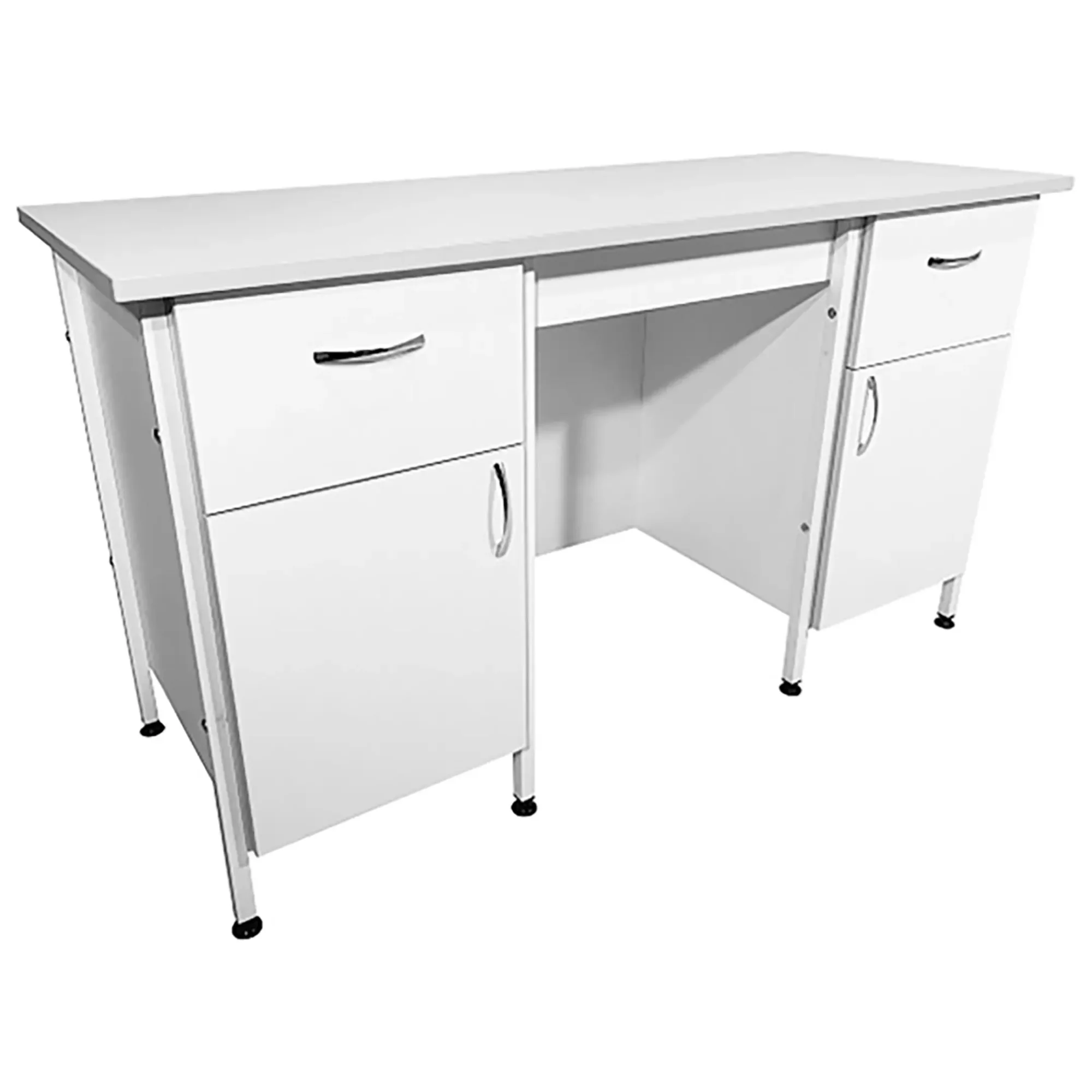 Стол лабораторный СЛ 12.017 (белый) — это функциональное и элегантное решение для создания эффективного рабочего пространства не только в лабораториях, но и в медицинских учреждениях. Модель оснащена двумя тумбами с выдвижными ящиками, полками и распашными дверками. Каркас выполнен из стального профиля, столешница из ЛДСП толщиной 22 мм.