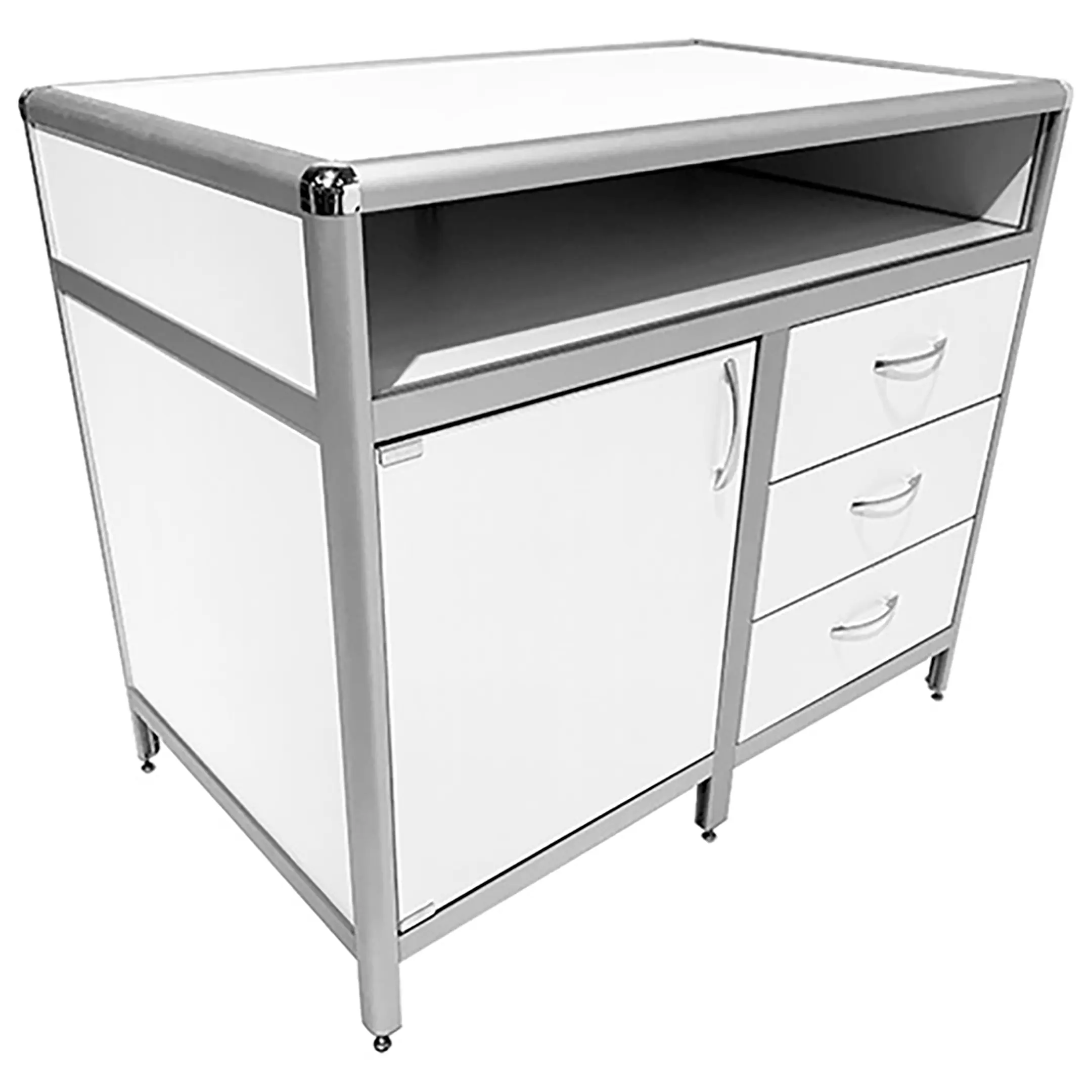 Стол-тумба лабораторная MED 12.008al (белый) — это функциональное решение для хранения лабораторного инвентаря, приборов и материалов в лабораториях и медицинских учреждениях. Модель оснащена вместительной нишей под столешницей (940х540х139 мм), тумбой с дверкой и полкой внутри, а также отделением с тремя выдвижными ящиками (434х70х406 мм). Каркас выполнен из алюминиевого профиля, столешница из ЛДСП толщиной 16 мм.