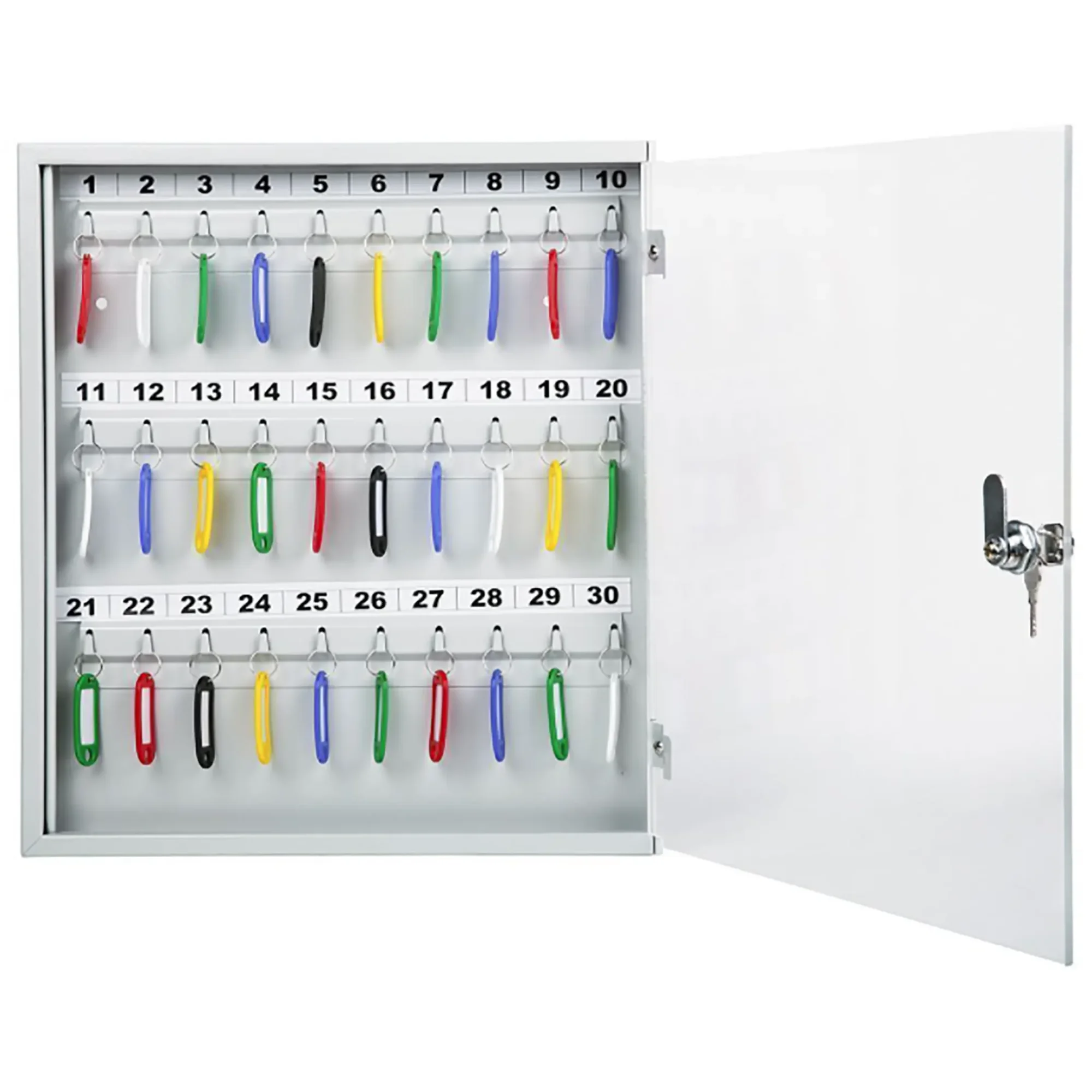 Ключница с прозрачной дверцей КЛС-30 (с брелками) — это практичная и наглядная система для организованного хранения ключей в учреждениях и на предприятиях. Конструкция со стеклянной дверцей и полным комплектом брелков обеспечивает удобный визуальный контроль, быстрый поиск и надежную защиту для 30 комплектов ключей.
