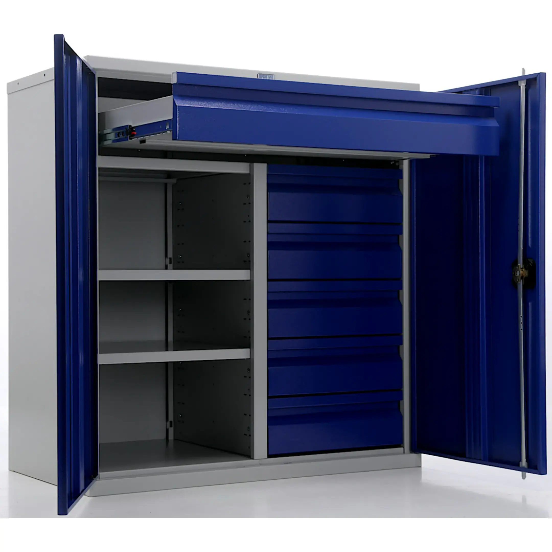- Надежная защита инструментального парка — цельнометаллический корпус с запирающимися на общий замок дверями обеспечивает высокий уровень безопасности. Это защищает содержимое от краж, несанкционированного доступа, а также от пыли, грязи, стружки и влаги, характерных для производственной среды.
