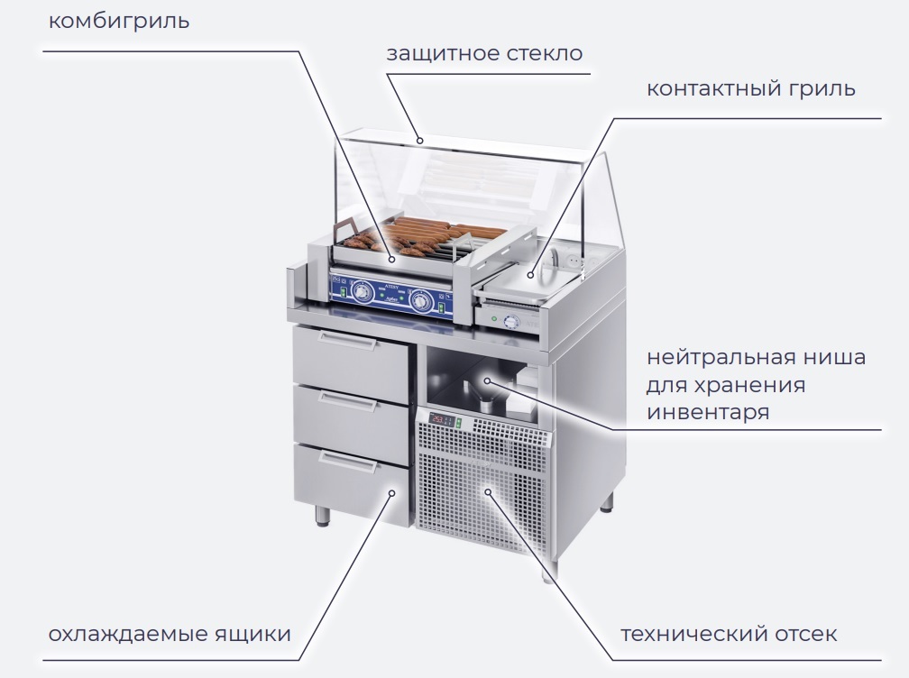 Станция для бургеров и хот-догов БАВАРИЯ предназначена для комплексного оснащения рабочего места приготовления и продажи хот-догов и бургеров, а также для хранения предварительно охлажденных мясных полуфабрикатов, хлебобулочных изделий, начинок и соусов.
