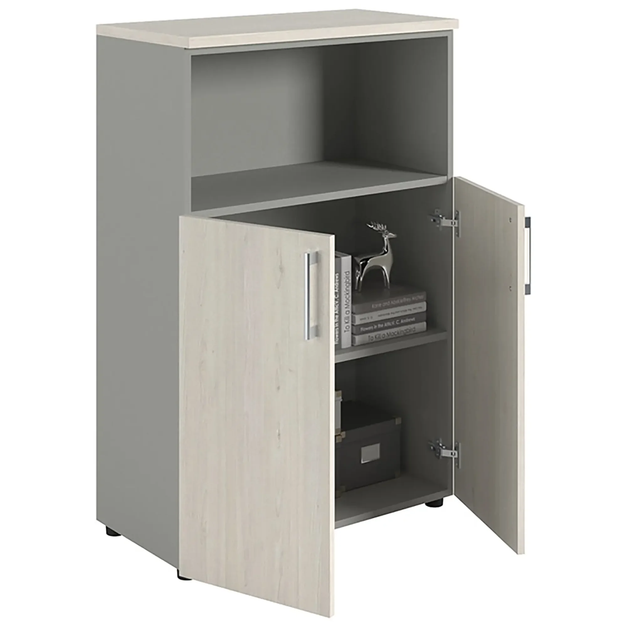 Шкаф NW 1280/2 полузакрытый белое дерево/серый предназначен для хранения.