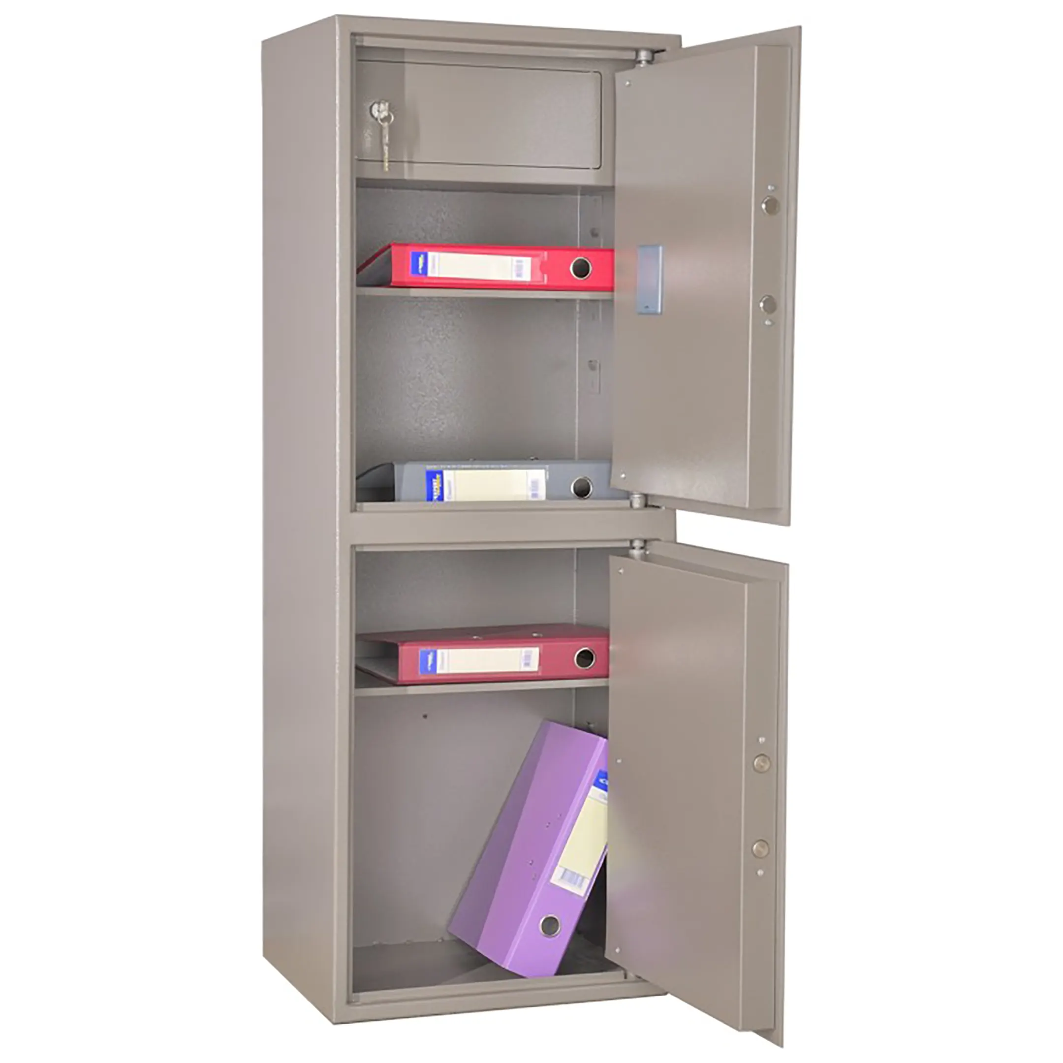 - Универсальность применения — благодаря вместительности, системе безопасности и продуманной конструкции, шкаф подходит для решения широкого круга задач. Он может использоваться как для архивного хранения с повышенными требованиями к безопасности, так и для повседневного рабочего процесса.