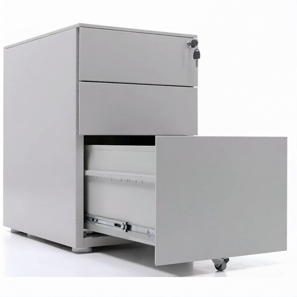 Опции: пластиковые лотки и металлический ящик для канцелярских принадлежностей и других предметов. Возможность комбинирования цветов: корпус + фасады ящиков и крышка (конструкция тумбы металл+металл). Или отделка фасадов ящиков и крыши тумбы ламинированной плитой ЛДСП (конструкция тумбы металл+ЛДСП)