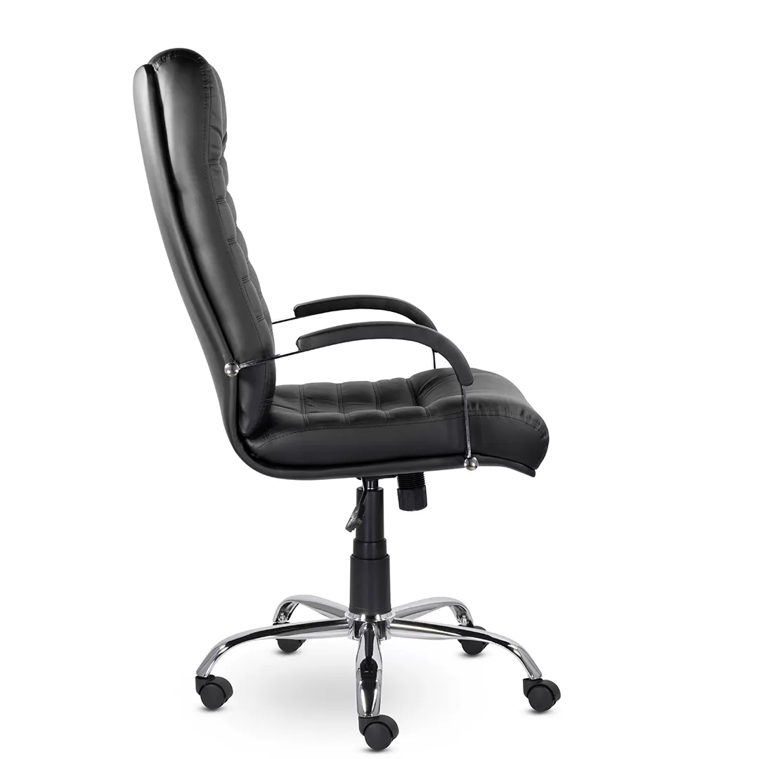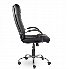 Массивное кресло руководителя оснащено горизонтальными прострочками по всей ширине спинки и хромированными подлокотниками с мягкими накладками. Механизм качания позволяет регулировать высоту сиденья, обеспечивает режим свободного качания и фиксацию каркаса в рабочем положении. Максимальная нагрузка составляет 120 кг.