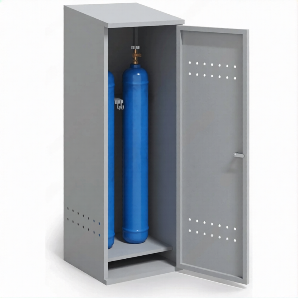 - Обеспечение требований пожарной безопасности для специфичного оборудования — прочный металлический корпус обеспечивает необходимую изоляцию баллонов от источников возгорания. Наличие системы вентиляции (перфорация или вентиляционные решетки) гарантирует воздухообмен для отвода возможных утечек газа, предотвращая создание опасной концентрации, что особенно важно при хранении в замкнутых помещениях лабораторий или медкабинетов, и соответствует нормам ППР.