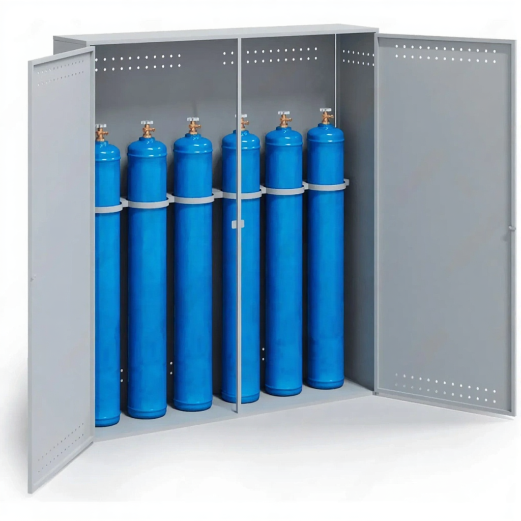- Оптимальная вместимость для средних потребностей — шкаф идеально подходит для мастерских, участков и лабораторий, где одновременно используется до шести газовых баллонов. Его габариты позволяют удобно разместить баллоны, обеспечивая к ним доступ, без излишнего занимания полезной площади помещения.