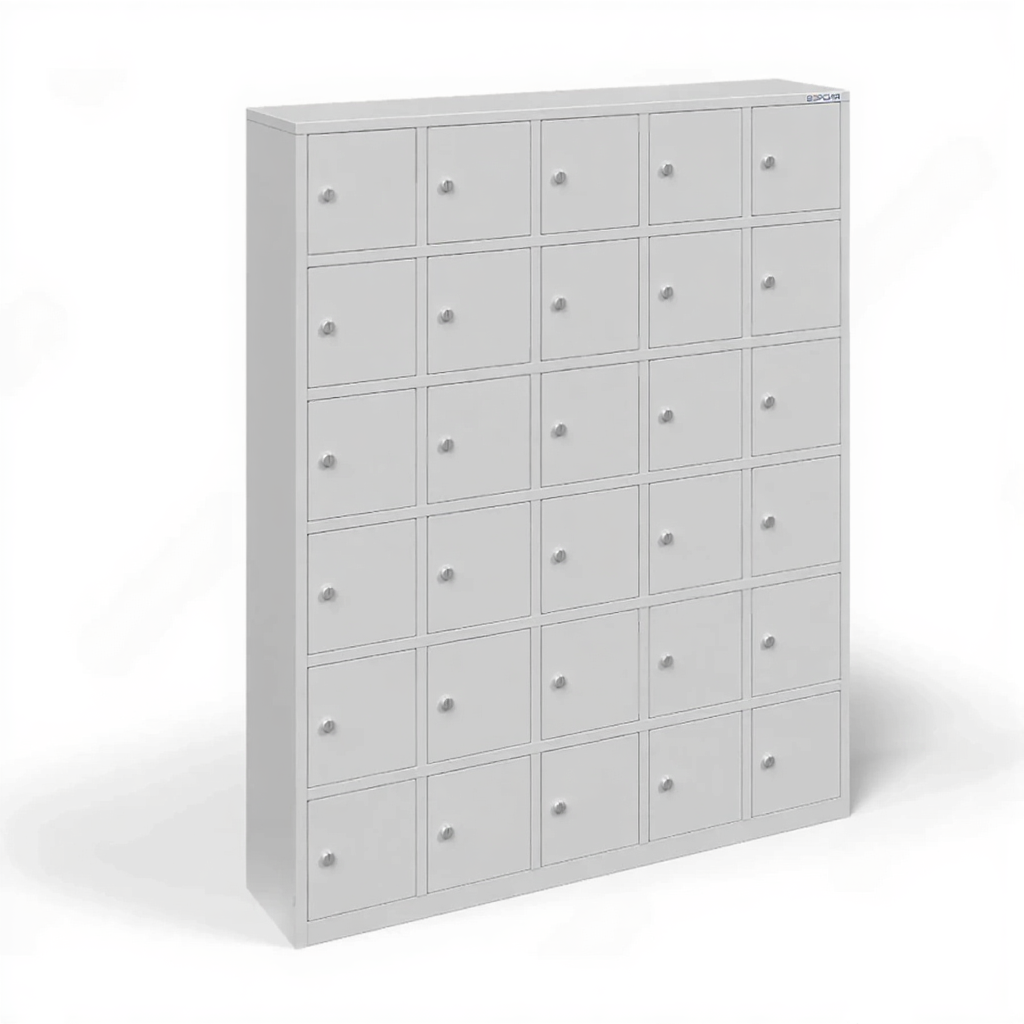 - Вертикальная компоновка и экономия пространства — шкаф высотой 1800 мм вмещает 30 ячеек, эффективно используя вертикальное пространство помещения. Это позволяет разместить большое количество мест для хранения, занимая при этом минимальную площадь на полу, что критически важно для узких холлов, рекреаций или проходных зон.