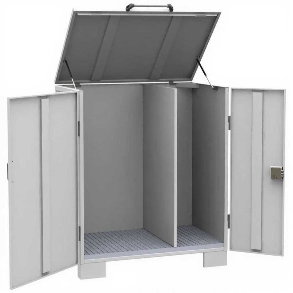 - Защита от несанкционированного доступа и внешних воздействий — запирающаяся металлическая конструкция надежно защищает содержимое от кражи, а также от пыли, грязи и атмосферных осадков (при установке под навесом или внутри помещения).